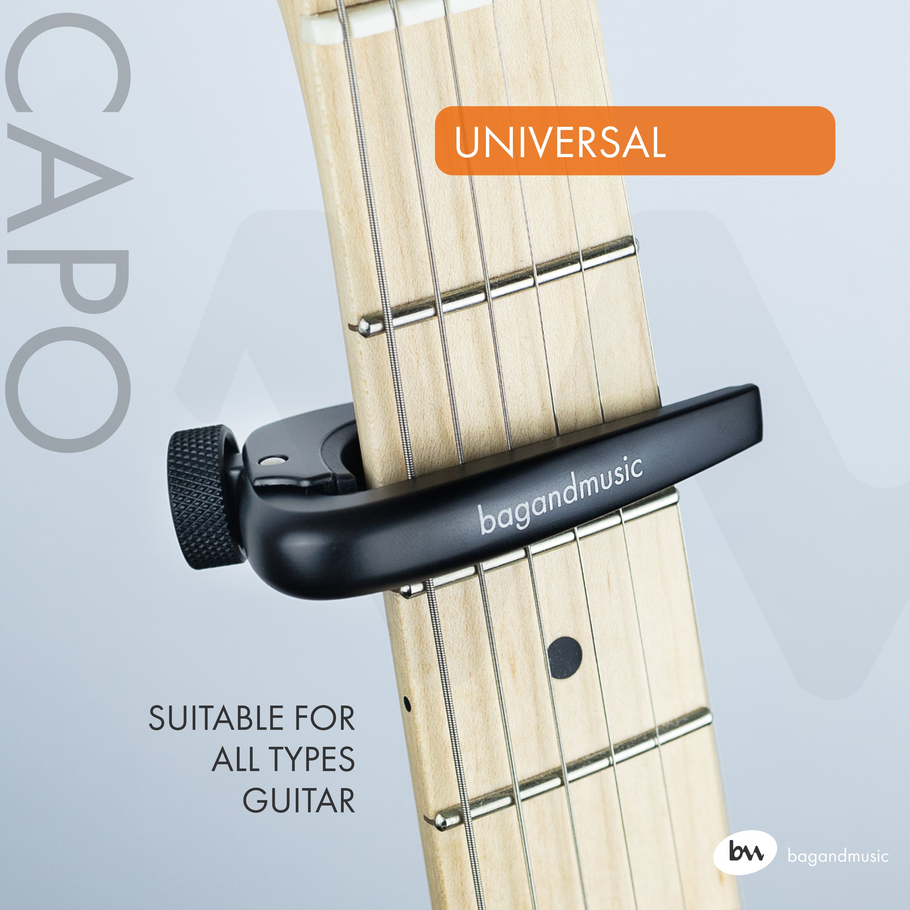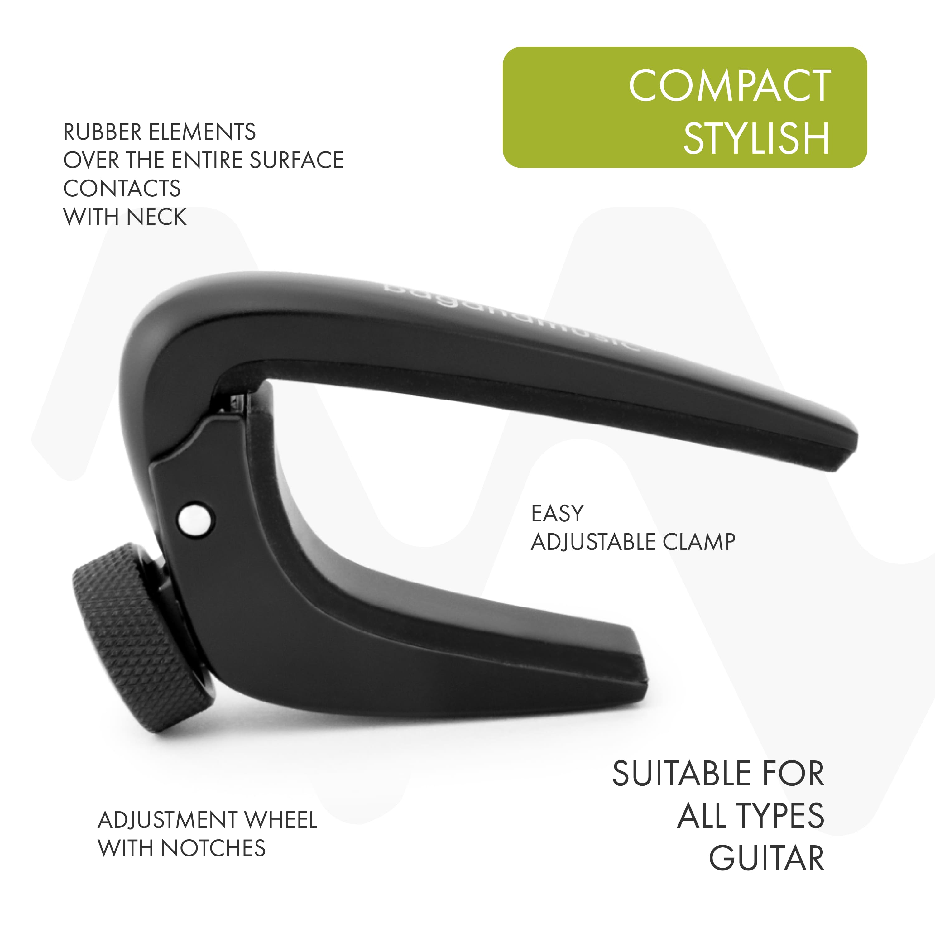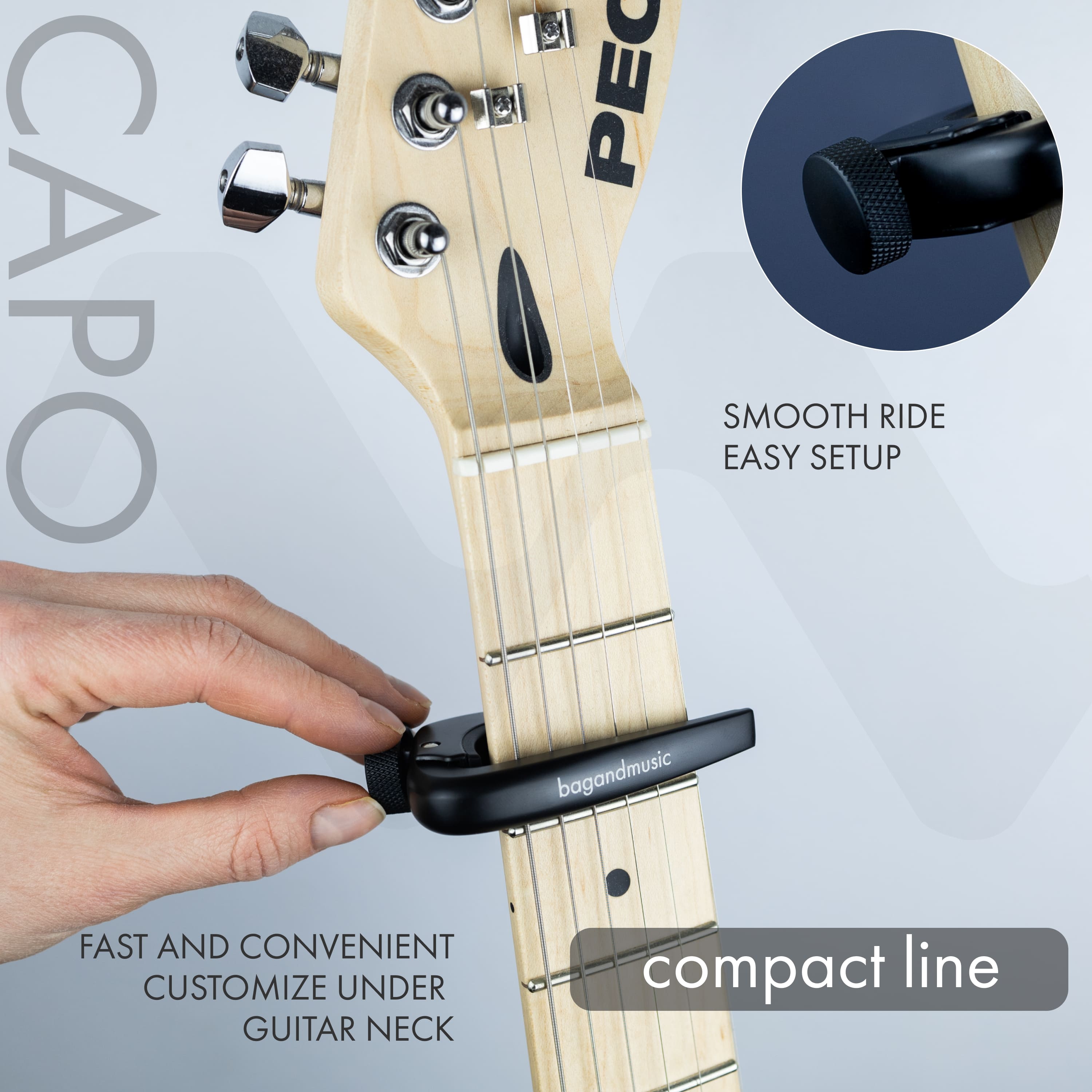 The compact screw capodaster is a stylish and functional accessory for musicians that provides reliable and comfortable clamping of strings on the neck. Its compact design makes it an ideal choice for those who value portability and ease of use. A special feature of this capodaster is the adjustable clip, which allows you to quickly and easily adjust it to any neck thickness, ensuring versatility of use. The adjustment wheel with notches ensures smooth and precise adjustment of the degree of pressing of the strings to the frets. Rubber elements located along the entire surface of contact with the fingerboard provide additional protection from scratches and damage, as well as improve grip, preventing the capodaster from slipping during play.