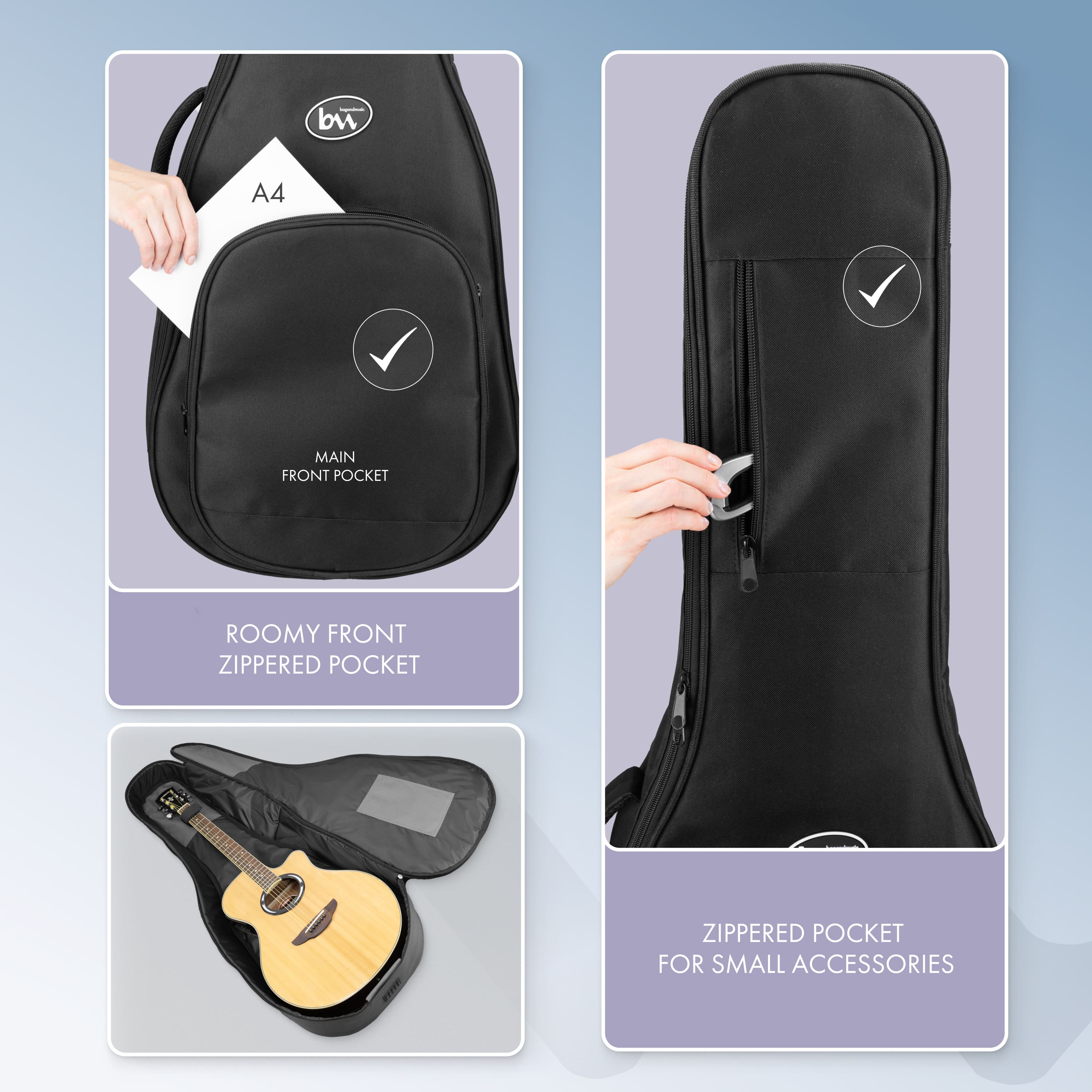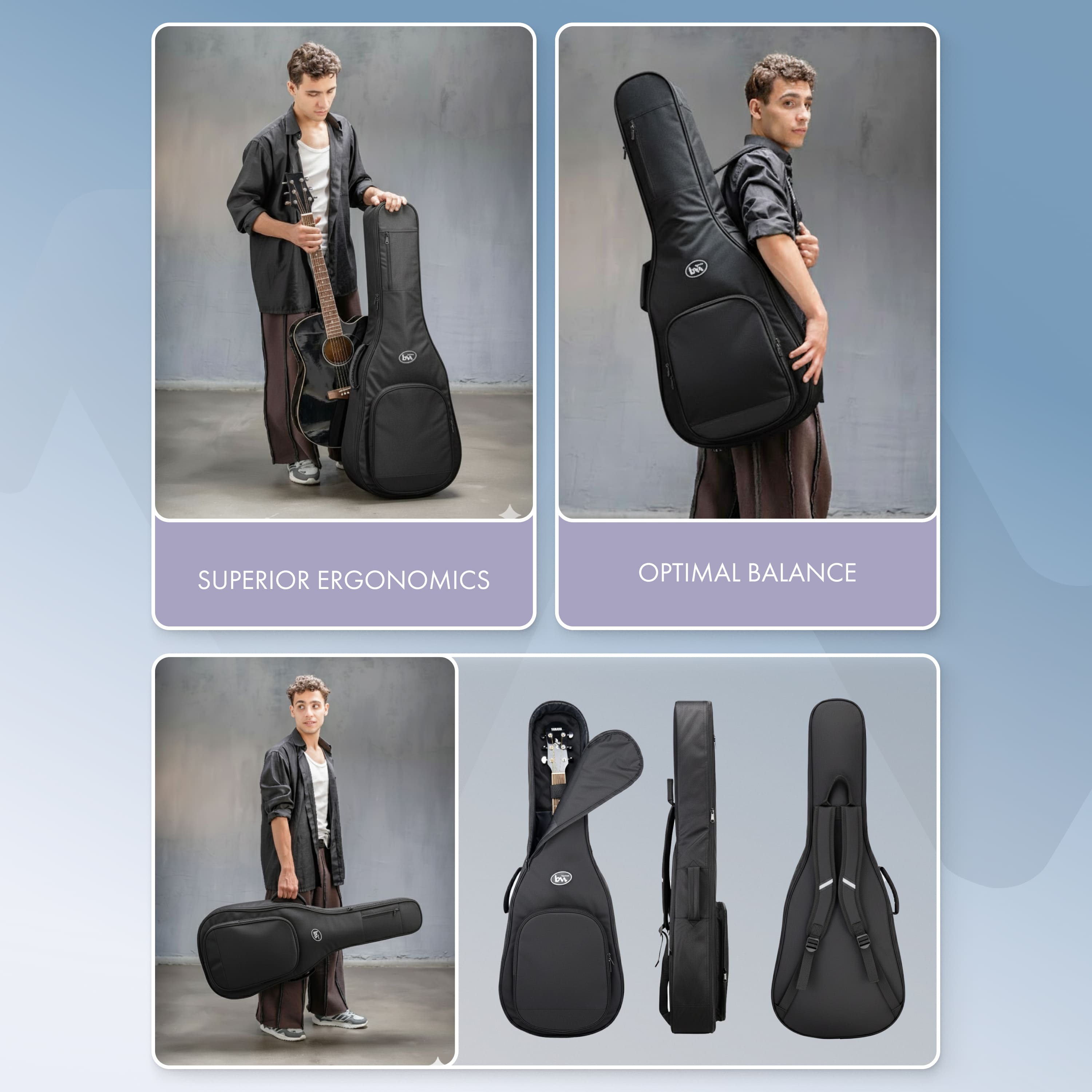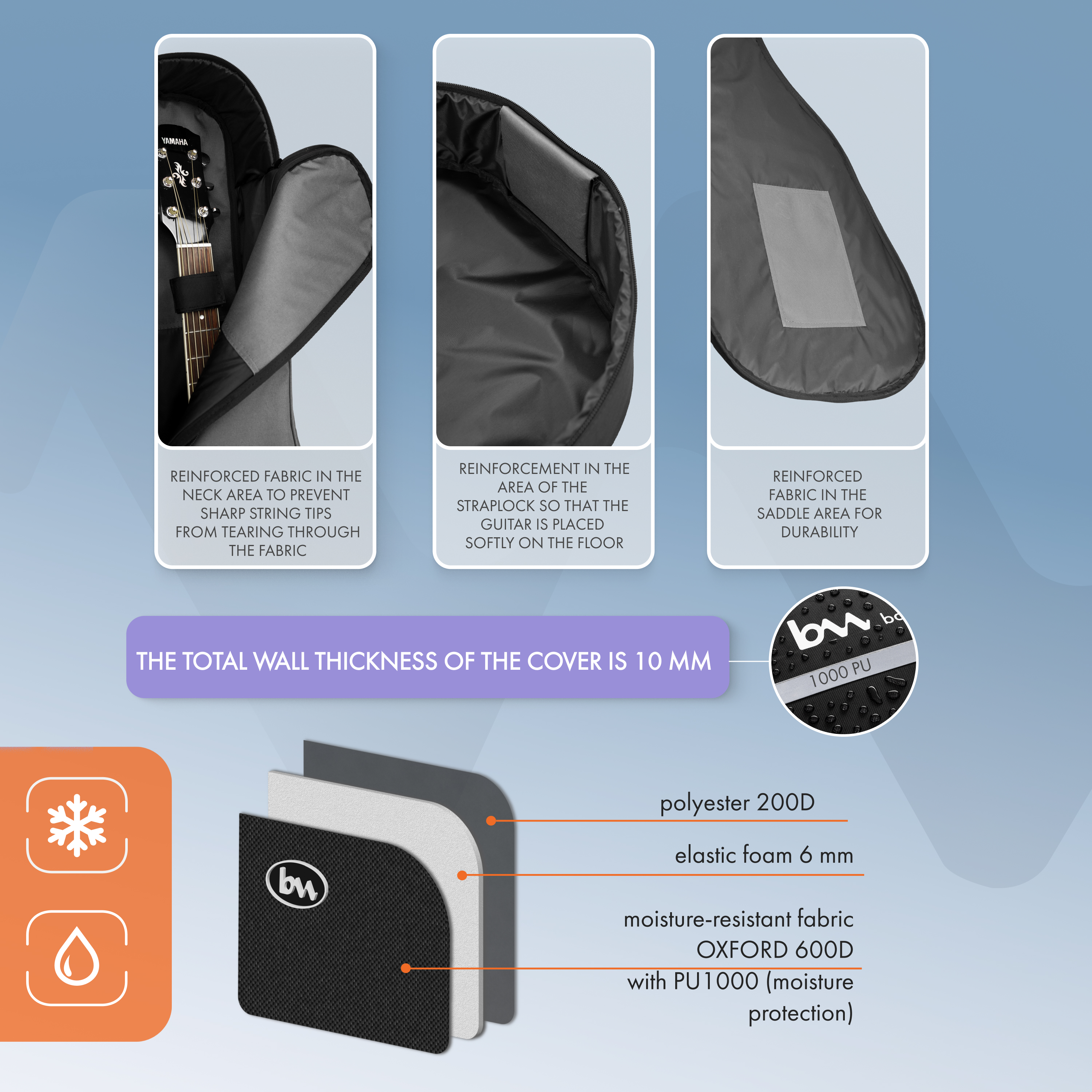 The Simple case is a universal solution for your acoustic guitar of any shape. It is also suitable for classical guitars (with some margin in length, width and depth). Thanks to its thoughtful design and high-quality materials, it will provide reliable protection and ease of use.