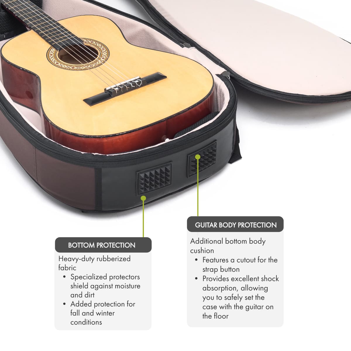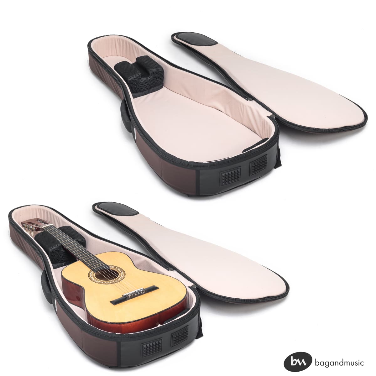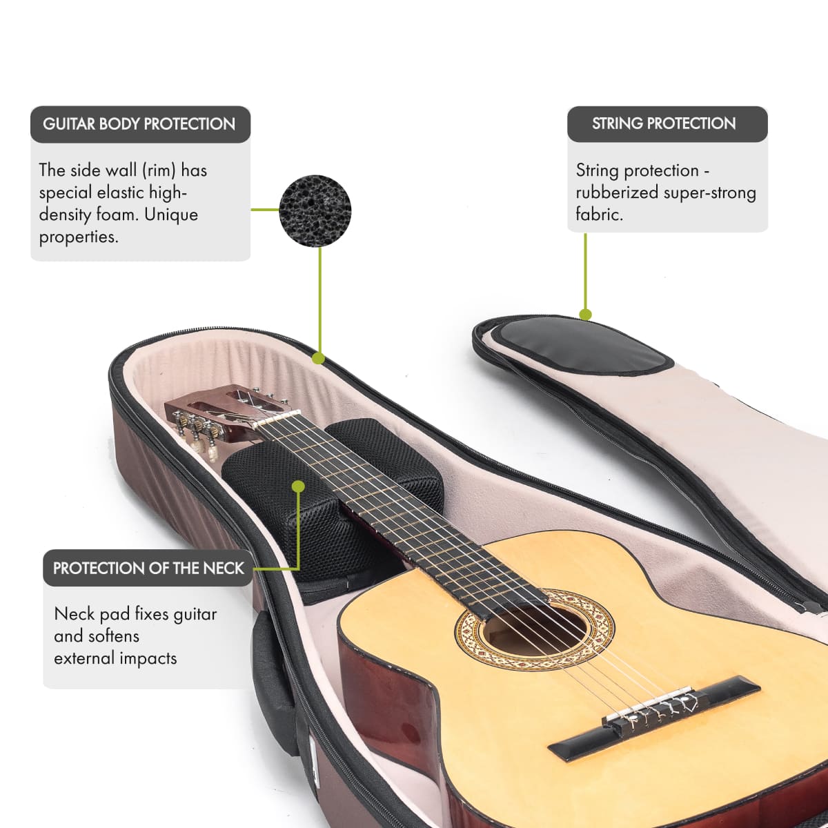 Solid Protection: 20-30 mm padding combined with a high-density foam rim absorbs impacts effectively. The interior features rubberized, super-strong fabric to protect against sharp string ends and bridge hardware.