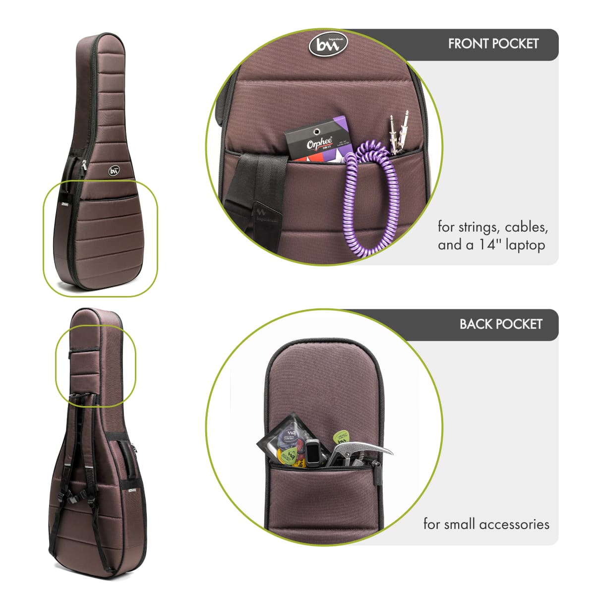 Storage: A spacious front pocket fits a 14" laptop and cables, while a discrete back pocket keeps small accessories like picks and tuners safe.