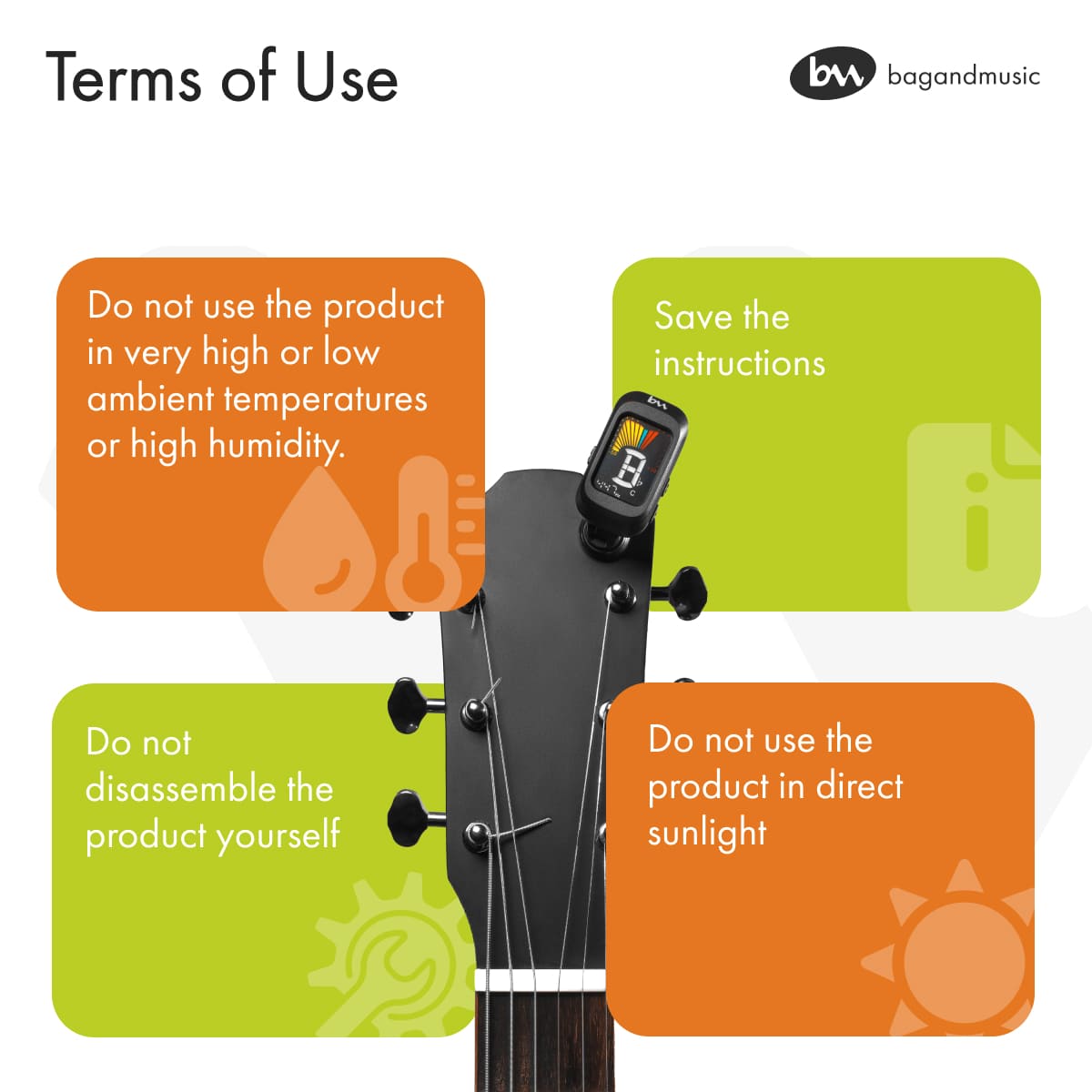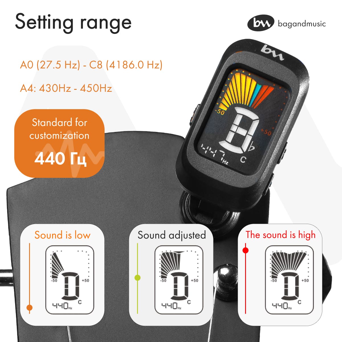 With our digital tuner, you get the opportunity to improve the sound quality of your guitar. We guarantee you the high quality, ease of use and durability of our product.