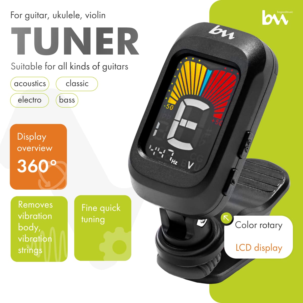 • Piezoelectric principle • The ability to fine-tune the build frequency • The ability to select a reduced build • Lightweight and compact design • Bright LCD display with 360° view. • Tuning modes: C (chromatic), G (guitar), B (bass), V (violin), U-C (ukulele in standard Up), U-D (ukulele baritone D)